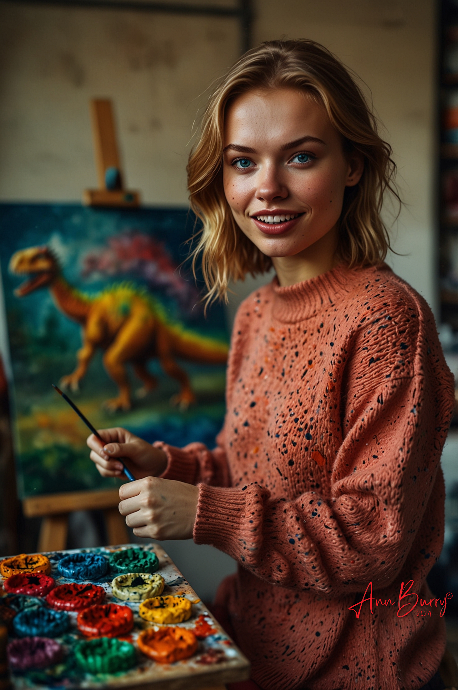 It was no surprise to anyone that I became a painter, nor was it surprising that my subject of choice was dinosaurs. Every stroke of my brush brings these magnificent beasts to life, capturing their grandeur and might, their grace and ferocity. My studio, a small converted barn on the outskirts of town, is a sanctuary where the past and present collide.